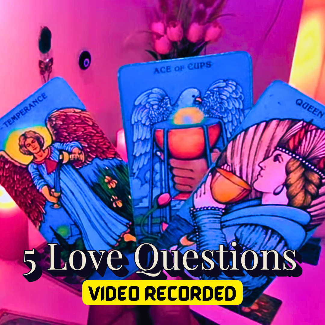 In this tarot reading you can ask up to five questions about love and you will receive the in-depth answer in a 20 to 40 minutes video recorded reading.